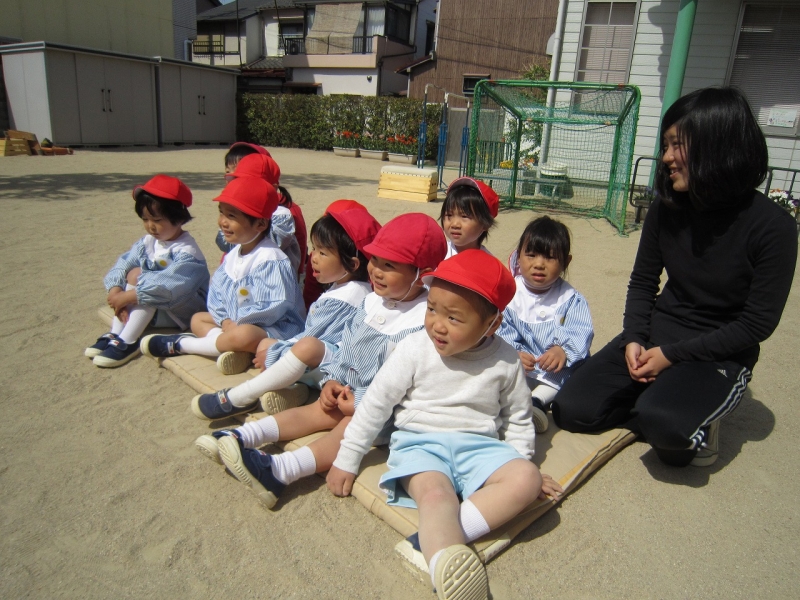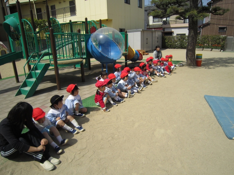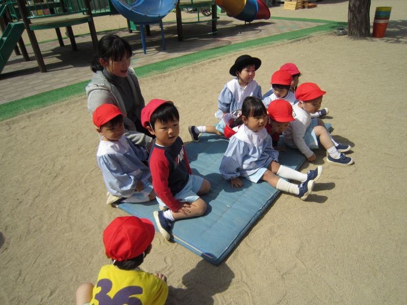 みんなはすかさず園庭の真ん中に作ったお家にペッタン!!お話をよく聞き上手に歩けたみんなです♪あまりにも上手だったので特別に、幼稚園を飛び出し、ぐるーっと歩いてみました★