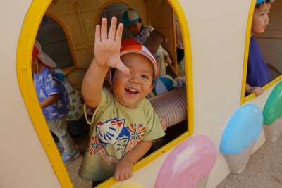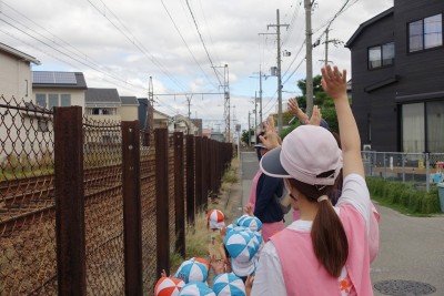 子どもたちに手を振っ