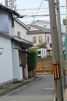 小さな神社の前で、